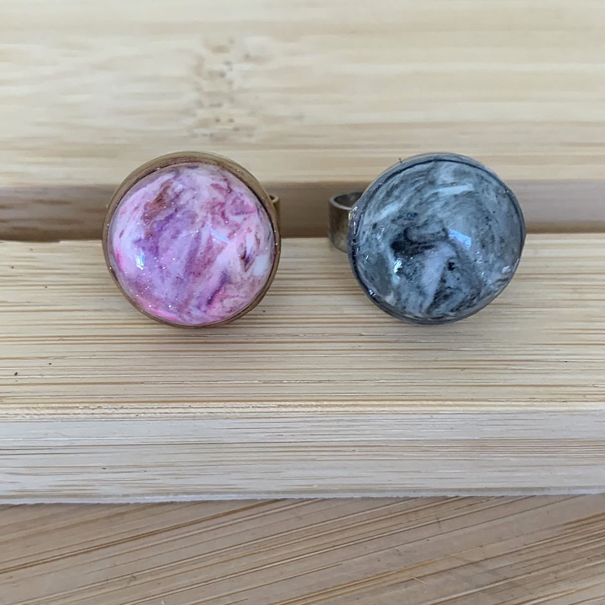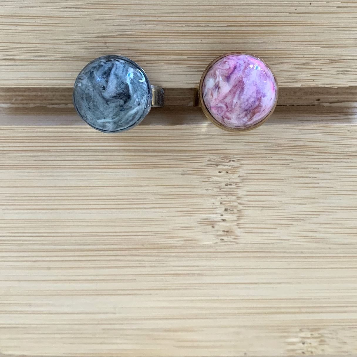 Apportez une touche d’élégance à vos mains avec ces bagues réglables en résine minérale. Chaque pièce est façonnée à la main en pâte polymère, ce qui en fait un bijou unique aux reflets subtils et changeants.