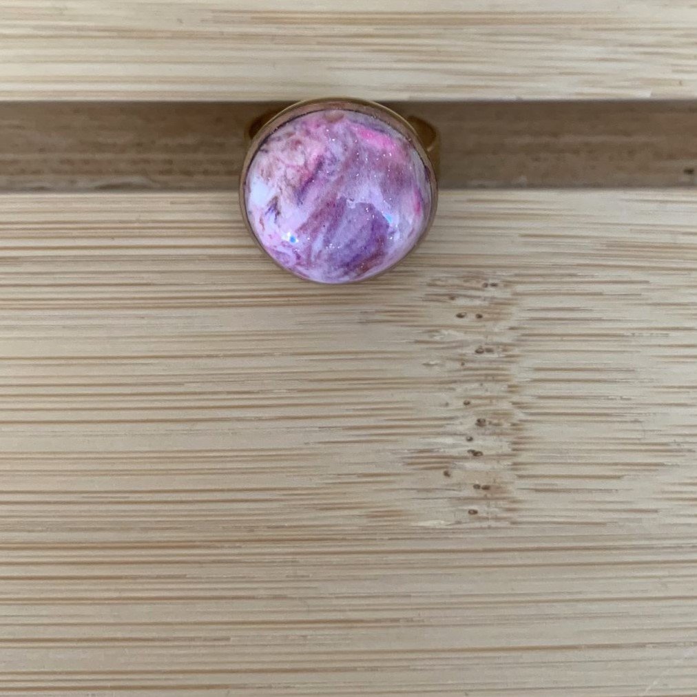 Bague rose : cabochon rond, mélange de blanc, rose pâle, violet.