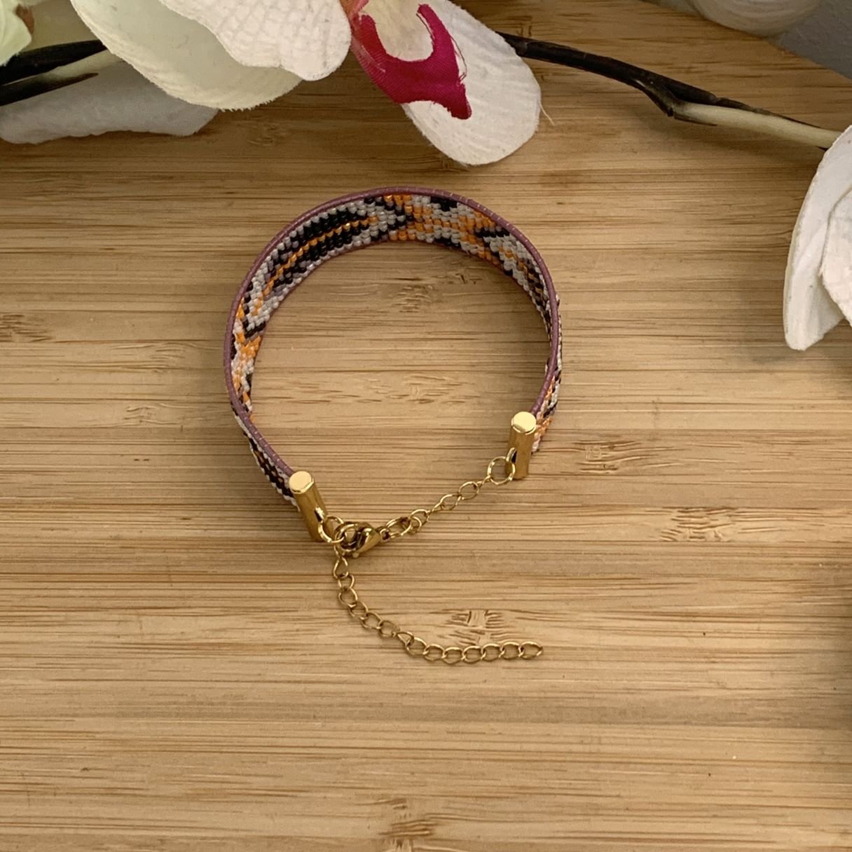 Découvrez mon bracelet en perles Miyuki fait main, tissé avec soin en utilisant des perles Miyuki de haute qualité. Doté d’un fermoir acier inoxydable doré, ce bracelet artisanal est l’accessoire parfait pour toutes les occasions. De plus, un cordon de cuir 100% naturel de couleur parme entoure les perles, offrant ainsi une touche d’élégance et une belle finition. Ce bracelet ajustable  est idéal pour un cadeau ou pour compléter votre collection de bijoux.