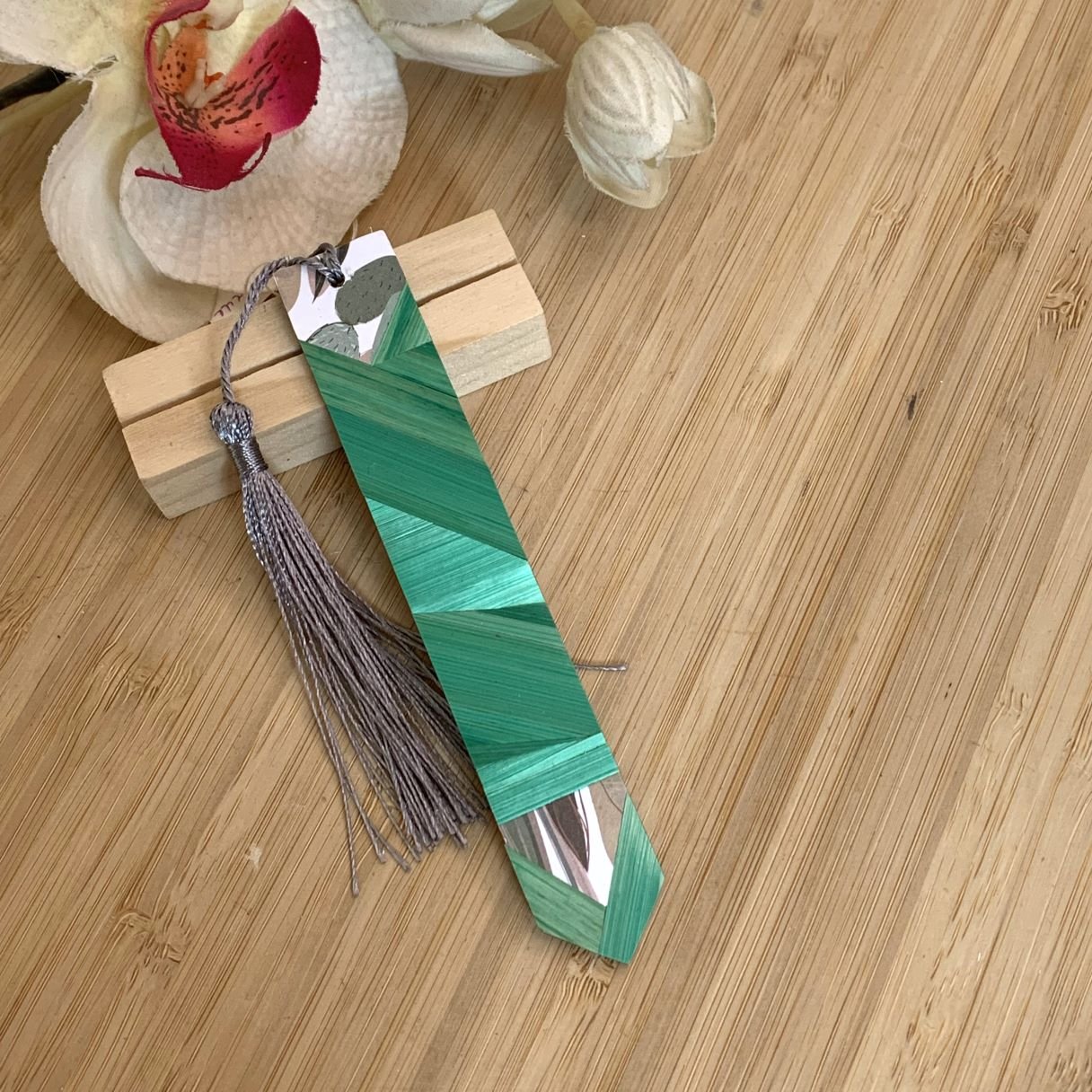 L’Art de la Matière Plongez dans l’univers de l’artisanat d’art avec ce marque-pages exclusif. D’un côté, la marqueterie offre un jeu de lumière fascinant : les fibres de paille captent l’éclat pour révéler des nuances vibrantes de vert. De l’autre, un papier aux jolies feuilles automnales apporte une touche de sérénité avec son fond blanc, ses couleurs douces du vert d’eau en passant par le beige et un rose poudré.