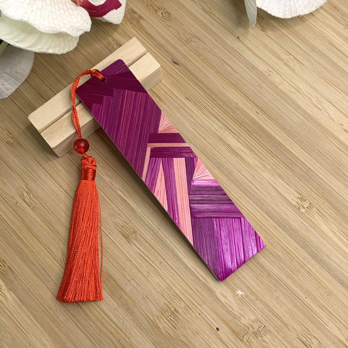 Matériaux Nobles et Finitions : Le support est en bambou, choisi pour sa robustesse et sa légèreté. Les nuances de vieux rose, violet et rouge créent un dégradé chaleureux et élégant. Pour parfaire l’ensemble, un élégant pompon rouge en soie à perle nacrée permet de retrouver votre page en un clin d’œil.