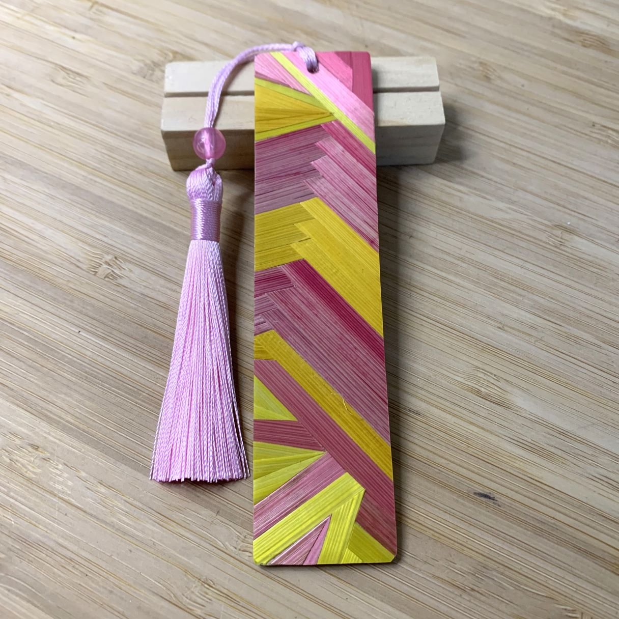 Ce marque-pages est une véritable pièce d’artisanat d’art à glisser entre vos pages. Le recto présente un motif contemporain en marqueterie de paille aux teintes vibrantes de rose, jaune, créant des jeux de lumière fascinants à chaque mouvement.