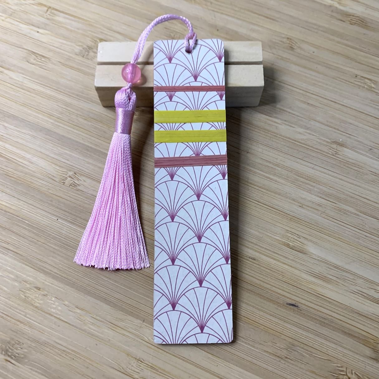 Finitions : Un pompon en soie soyeux rose assorti, agrémenté d’une perle délicate, pour retrouver facilement votre page.
