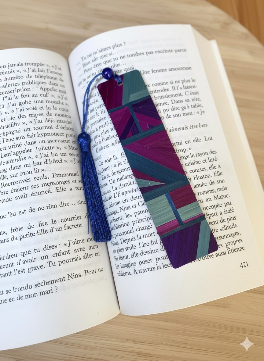 Chaque marque-pages est une pièce unique, confectionnée avec patience dans mon atelier de l’Oise. La paille est fendue, aplatie et collée brin par brin pour créer un décor impossible à reproduire à l’identique. En choisissant « Brise d’Orient », vous soutenez un artisanat d’art durable et passionné.