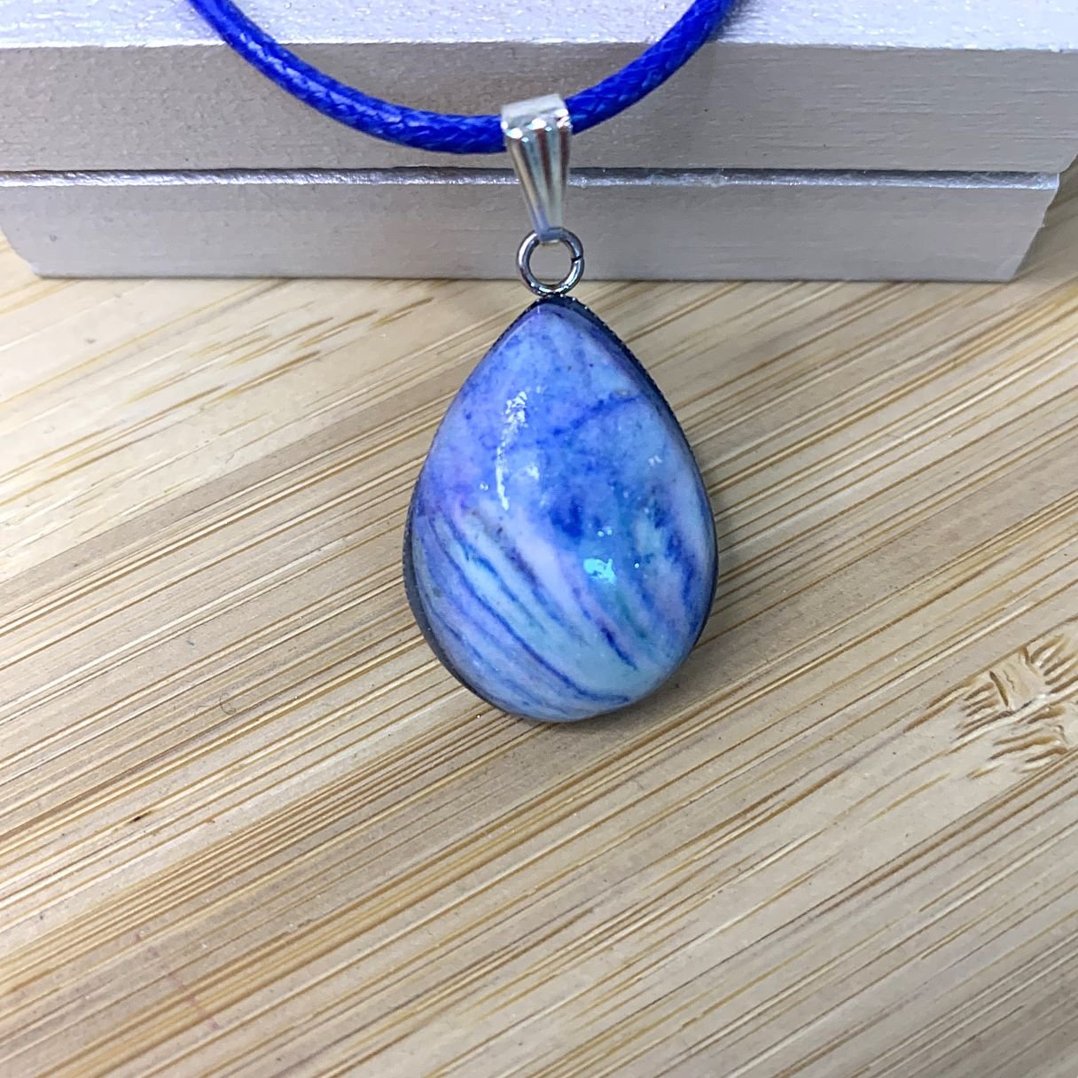 Caractéristiques : Ce pendentif goutte est très léger ce qui le rend confortable à porter tout au long de la journée. Les couleurs sont des dégradés de bleu, blanc et vert, lumineuses et élégantes s’accorderont avec toutes vos tenues, des plus décontractées aux plus sophistiquées. Vous pourrez adapter vos cordons ou chaines à votre convenance.